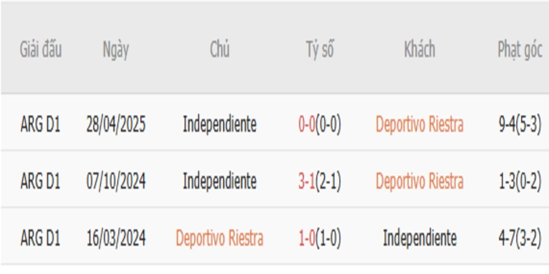 Những cuộc đối đầu gần đây giữa hai đội bóng này diễn ra rất căng thẳng, với Independiente thường chiếm ưu thế về tấn công điều này được thể hiện rõ qua chiến thắng 3-1 của họ tại vòng trụ hạng năm 2024. Deportivo Riestra đã giữ vững tỷ số hòa 0-0 hồi đầu năm 2025, cho thấy rõ sự tập trung vào phòng ngự của họ.